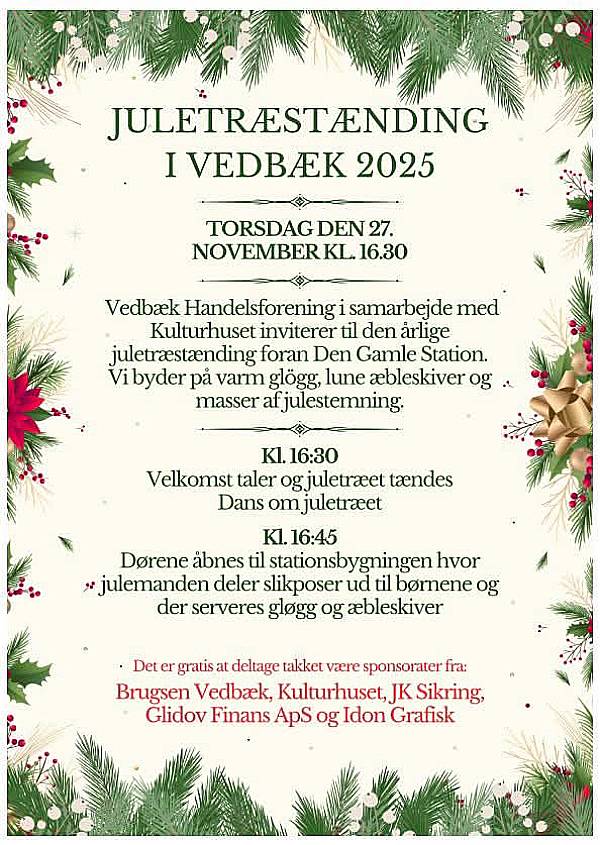 I samarbejde inviterer Vedbæk Handelsforening og Vedbæk Kulturhus igen store og små til den legendariske juletræstænding foran Vedbæk Kulturhus ved den gamle stationsbygning på Vedbæk Stationsvej – hvor vi sammen tænder lysene på byens smukke juletræ og der synges, spises, danses, hygges – måske kommer julemanden forbi i år kl. 16:30 og officielt skyder julen i gang.